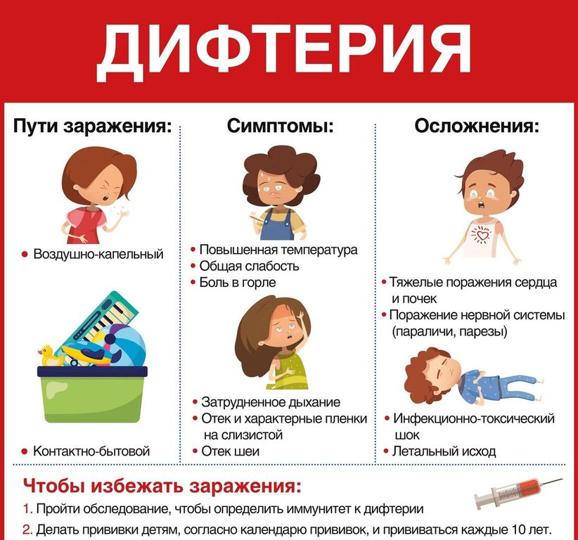 Дифтерия развивается при заражении бактерией Болезнь может поражать разные органы, но чаще всего диагностируют дифтерию ротоглотки. По симптомам она похожа на ангину — проявляется болью в горле и налётом на миндалинах. Без лечения дифтерия протекает очень тяжело и может привести к летальному исходу. Пути передачи дифтерии: воздушно-капельный: когда инфицированный чихает или кашляет, частички слюны или слизи из носа с бактериями «распыляются» в воздух; контактно-бытовой: бактерии оседают на различных поверхностях, например дверной ручке, и при прикосновении к ним, а затем к лицу, попадают в организм. Дифтерийная палочка может в течение 15 дней оставаться на посуде, игрушках, предметах личной гигиены, дверных ручках и выключателях; пищевой: бактерия выживает в продуктах, к которым прикасался инфицированный. Например, известны вспышки заболеваемости с заражением через молочные продукты. Около 90% случаев дифтерии связаны с инфицированием от здоровых носителей коринебактерий. Такой путь передачи очень опасен: носители выступают в роли скрытого источника инфекции, из-за отсутствия жалоб и симптомов их сложно выявить. А значит, носителей не изолируют от коллектива и не лечат. В некоторых случаях найти бессимптомного носителя инфекции не удаётся даже после всплека заболеваемости. Чаще всего дифтерия проявляется слабостью, недомоганием, головной болью, ознобом и повышением температуры максимум до 38 °C. На следующий день температура может подняться выше. Через несколько часов после возникновения первых симптомов появляется боль при глотании, которая стремительно нарастает в течение следующего дня. Слизистые оболочки горла краснеют, и на них образуется налёт серо-белого цвета в виде плёнки, которая отделяется с трудом, обнажая кровоточащую поверхность. В зависимости от формы болезни плёнка может покрывать миндалину полностью, а может — только частично. Кроме того, она может распространяться на всю глотку и затруднять дыхание. Прогноз и профилактика Прогноз дифтерии зависит от возраста пациента и клинической картины болезни. Тяжелее всего её переносят дети до 5 лет и взрослые старше 40. Если симптомы наблюдаются на протяжении 4–5 дней, но пациент не обращается за медицинской помощью, риск летального исхода сильно повышается. Это связано с тем, что токсины, выделяемые бактерией, довольно быстро выводят из строя внутренние органы и сердце. При своевременном обращении к врачу и постановке диагноза прогноз в целом благоприятный для любой формы, если удалось предотвратить тяжёлую интоксикацию и поражение других органов. Основным методом профилактики дифтерии считается прививка. Родителям важно следить за национальным календарём профилактических прививок. Согласно этому документу, прививка АКДС от дифтерии (она включает также вакцину от коклюша и столбняка) делается детям в 3; 4,5; 6; 18 месяцев, а также в 6–7 и 14 лет.