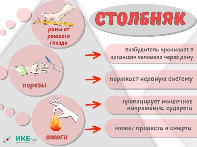Столбняк— это острое инфекционное заболевание нервной системы, которое вызывают токсинобразующие бактерии Clostridiumtetani (столбнячная палочка). Болезнь проявляется неконтролируемыми мышечными сокращениями в шее, челюсти, животе или во всём теле в результате поражения нервной системы токсинами бактерии-возбудителя. Примерно в половине всех случаев заражения столбняк приводит к смерти. Механизм передачи столбняка — контактный: болезнь развивается, если в рану, порез или ссадину попадает бактерия Clostridiumtetani. В неактивном (спящем) состоянии бактерия может долгое время находиться в почве и фекалиях животных. Попадая в благоприятную среду, она активируется и начинает быстро размножаться. Благоприятная среда — это рана, любое повреждение кожи. Вероятность заражения значительно увеличивается, если в рану попадает земля, фекалии, ржавчина или слюна. Как правило, заболевание проявляется повторяющимися болезненными спазмами во всём теле, которые длятся несколько минут. Шея и спина при этом могут выгибаться, мышцы ног сокращаются, руки прижимаются к туловищу, а кулаки сжимаются. Из-за спазмов мышц шеи и живота может быть трудно дышать. Из-за спазмов челюсти — сложно или невозможно открыть рот. Мышечные спазмы при столбняке могут быть вызваны незначительными внешними факторами, такими как громкий звук, прикосновение, дуновение ветра или яркий свет. Столбняк опасен для жизни. При обнаружении симптомов нужно как можно скорее обратиться к врачу. Профилактика столбняка Профилактика столбняка имеет два направления: плановая иммунизация по графику прививок и экстренная иммунизация при травме. В рамках плановой иммунизации дети получают прививки от столбняка в составе комплексной вакцины пятикратно: в 2, 4, 6 и 18 месяцев и в 4–6 лет. Ревакцинация проводится в возрасте 11–12 лет. Далее подростки и взрослые должны проходить вакцинацию каждые 10 лет. Более защищены от столбняка те, кто был вакцинирован: их иммунная система нейтрализует тетаноспазмин с помощью антител — антитоксинов, которые представляют собой иммуноглобулины класса G. В случае травмы вакцинацию назначают с учётом сделанных в прошлом прививок и характера раны. |