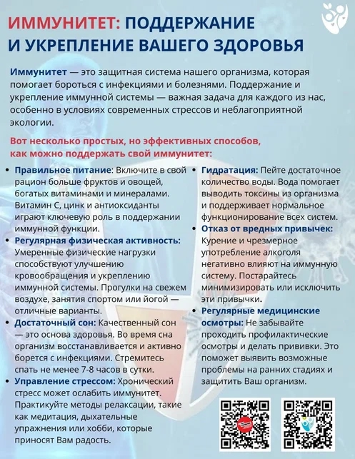 Проведена лекция в формате занятия, где получатели социальных услуг получили информацию о предназначении иммунной системы организма,которая охраняет организм от воздействия болезнетворных микроорганизмов и вирусов, причем не только от микробов и паразитов, но и от выходящих из-под контроля клеток собственного организма. Вакцинация – простой, безопасный и эффективный способ защиты от болезней до того, как человек вступит в контакт с их возбудителями. Неблагоприятно влияет на иммунитет: 1. Неправильный образ жизни (употребление алкоголя, курение, малое количество физической активности); 2. Стрессы, депрессивное состояние, повышенная раздражительность, усталость и плохой сон; 3.Окружающая среда; 4. Неправильное питание. - Иммунная защита организма напрямую зависит от того, что мы едим. Белковая пища обеспечивает организм необходимыми аминокислотами для образования антител и других агентов иммунитета. Жиры нужны для построения иммунных клеток, а углеводы дают энергию для функционирования иммунной системы. Иммунитет — это природный механизм защиты нашего организма от болезней. Если иммунная система ослаблена, организм становится уязвим к заболеваниям. И это время, чтобы уделить внимание приему витаминов. Витамин D Принимает участие в регуляции иммунитета. Помогут восполнить его прогулки под солнцем, потребление морской рыбы. Витамин B12 При дефиците - нарушение процесса кроветворения, функций нервной системы. Восполнить запасы помогут мясные и молочные продукты, бобовые и крупы. Магний Недостаток приводит к снижению иммунитета, депрессиям. Содержится в листовой зелени и зеленых овощах, орехах, крупах и бананах. Железо Дефицит не дает организму сформировать полноценный иммунный ответ на патогенные воздействия. Источники - мясо, печень, яйца, бобовые. Йод Дефицит приводит к респираторным заболеваниям с осложнениями. Источники - морская капуста, морепродукты, йодированная соль.